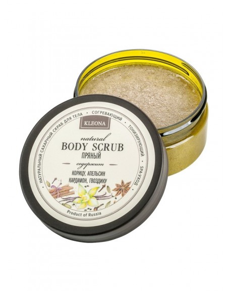 Состав: сахар, морская соль, вода, масло оливковое, масло кокосовое, масло карите, глицерин растительного происхождения, масло миндальных косточек, масло касторовое, триглицериды каприловой/каприновой кислот, алкилглюкозиды натрия, сквалан, глицерилолеат, имбирь, корица, гвоздика, кардамон, эфирное масло апельсина, бензиловый спирт, сорбитанкаприлат, лимонная кислота,черный перец, эфирное масло мускатного ореха, эфирное масло индийской мяты, экстракт ванили, комплекс полиненасыщенных жирных кислот (витамин F), токоферола ацетат (витамин Е).