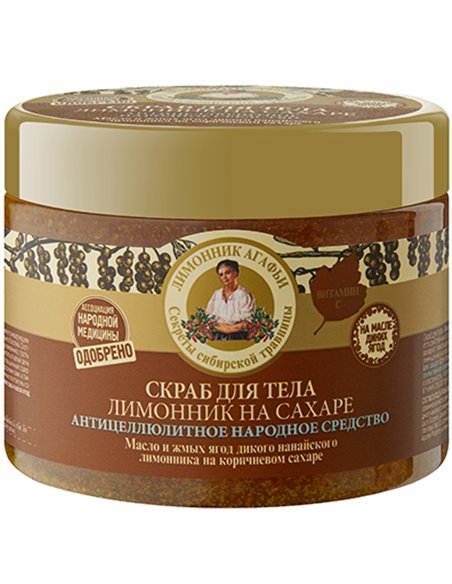 Скраб для тела «Лимонник на сахаре» создан по старинному народному рецепту и является действенным средством в борьбе с целлюлитом. Его природные компоненты активизируют микроциркуляцию, бережно обновляют и выравнивают кожу, способствуют уменьшению жировых отложений. Жмых ягод дикого нанайского лимонника на коричневом сахаре эффективно очищает, отшелушивает и смягчает кожу. Органическое масло семян таёжной брусники увлажняет и насыщает кожу витаминами, повышает упругость и эластичность. Масло ягод дикого нанайского лимонника стимулирует кровообращение в тканях, способствуя сжиганию жировых клеток и уменьшению целлюлита.
