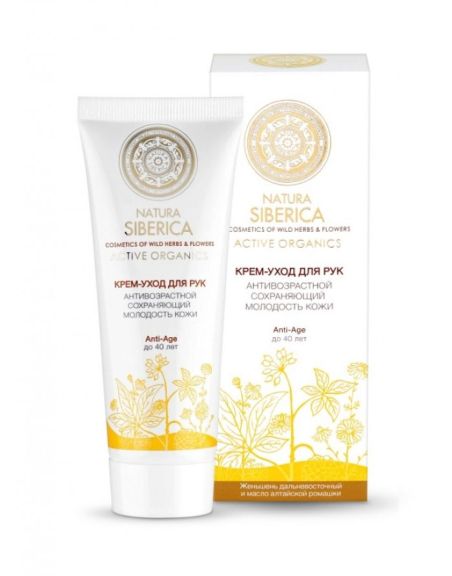 Антивозрастной крем-уход для рук Natura Siberica (Натура Сиберика) содержит экстракты женьшеня дальневосточного, алтайской ромашки, а также поливитаминный комплекс. Благодаря насыщенной натуральной формуле антивозрастного крем-ухода для рук Natura Siberica, он не только останавливает процессы увядания кожи рук, но также снимает раздражение и защищает кожу. Тонизирующие свойства женьшеня дальневосточного, противовоспалительные – алтайской ромашки, а также поливитаминный комплекс с содержанием витаминов Е, А и С позволяет активно питать, увлажнять, защищать и успокаивать кожу рук, надолго сохраняя их молодость.