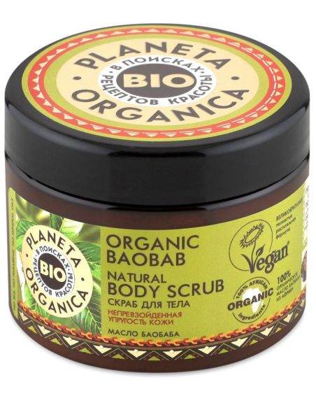 Натуральный скраб для тела Organic Baobab создан специально для бережного обновления кожи, придает ей гладкость и упругость. В плодах баобаба концентрируются более 35 витаминов и микроэлементов. Среди них витамины А,D,E, незаменимые Омега 3,6,7,9 жирные кислоты. Bio масло баобаба глубоко увлажняет кожу, делая ее ровной и эластичной. Bio абрикосовые косточки бережно отшелушивают и смягчают кожу, делая ее гладкой и упругой. Bio экстракт эфиопского кофе возвращает коже природный тонус, придавая ей сияние и соблазнительный аромат. NO SLS, NO PARABENS, NO MINERAL OILS