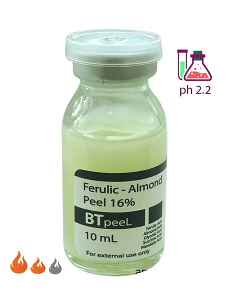 Способ применения: Тщательно взболтайте пилинг перед применением. Протрите кожу с помощью Эмульсия-эксфолиант с гликолевой кислотой и пептидным комплексом BTpee, подождите когда она полностью впитается. Нанесите ватным диском или ватными палочками раствор пилинга на кожу, избегая области вокруг глаз и губ. Время экспозиции будет зависеть от реакции кожных покровов и ощущений от 2 до 20 минут. Допускается нанесение до 5 слоев пилинга с выдержкой каждого слоя 1 минуту. При значительном покраснении кожи или сильном пощипывании (по десятибальной системе - выше 5-ти) экспозицию нужно прекратить. Для прекращения процедуры пилинг обильно смывается прохладной водой. После процедуры Ферулово-миндального пилинга рекомендуется использовать маску Увлажняющая стимулирующая маска с экстрактом розы и пчелиным воском BTpeel или Ламеллярную питательную маску "три масла" BTpeel. Для пролонгации и усиления действия пилинга, начиная со следующего дня после процедуры, ежедневно (вечером) использовать Эмульсия-эксфолиант с гликолевой кислотой и пептидным комплексом BTpeel.