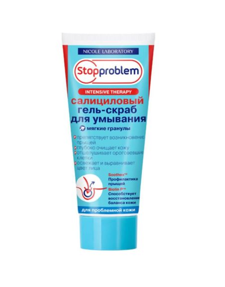 Гель-скраб за короткое время даёт заметный эффект, улучшая общий вид и цвет кожи. Гель отшелушивает ороговевшие клетки, обеспечивает очистку кожи, одновременно выравнивая тон кожи лица. В составе геля натуральные компоненты приносят много пользы: экстракты чистотела и мяты оказывают антибактериальное, освежающее и увлажняющее действие, череда и лиственничная губка участвуют в процессе детоксикации кожи, улучшают обменные процессы. Салициловая кислота и гранулы жожоба отшелушивают ороговевшие клетки эпидермиса, стимулируя обновление кожи, прочищают закупоренные поры. Применяйте гель несколько раз в неделю для умывания. Вспеньте небольшое количество геля-скраба с водой и нанесите круговыми движениями на лицо и шею, избегая области глаз. Помассируйте кожу и смойте большим количеством воды. Кроме того, для проблемной кожи наша компания разработала немало других эффективных и доступных средств. Попробуйте другие средства линии Stopproblem для очищения кожи.