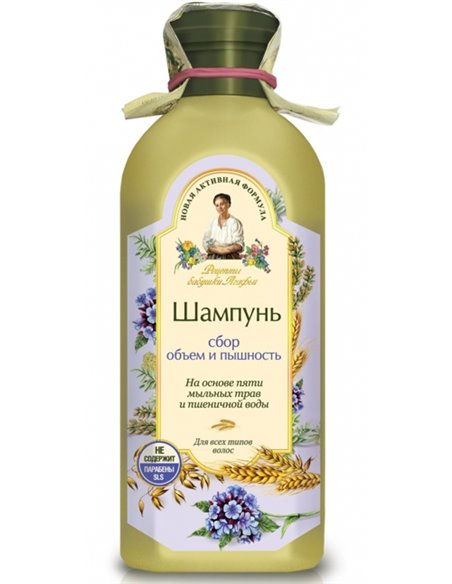 Пшеничная вода, входящая в состав шампуня, придает волосам естественный объем, а специально подобранные травы укрепляют их от корней до самых кончиков. Натуральная вспенивающая основа на пяти мыльных травах (солодка уральская, амарант, качим сибирский, белый и красный мыльные корни) мягко очищает волосы и кожу головы.