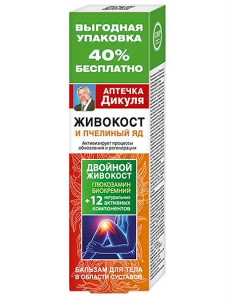 Бальзам для тела "Живокост. Пчелиный яд. 12 натуральных активных компонентов" серии "Аптечка Дикуля"- натуральное многокомпонентное средство для тела в области суставов и позвоночника. Действие бальзама направлено на активизацию кровообращения и нормализацию метаболизма в тканях, а также сохранение здорового функционального состояния, торможение деструктивных процессов. Основу бальзама составляет знаменитое лекарственное растение Окопник, уникальное по лечебному воздействию на кости и суставы. Это отражено и в его народных названиях: живокост, правокост; и в научном - Symphytum, от греческого Symphyo-сращивать, соединять. При суставных заболеваниях и травмах, в качестве заживляющего, противовоспалительного, анти ревматического средства окопнику нет равных. Его лечебные свойства высоко оценили врачи от Парацельса до Пирогова. Документально засвидетельствовано успешное лечение окопником болезней суставов у Ивана Грозного и императрицы Екатерины II. Сегодня он широко применяется в медицине многих стран. Особенно прославился окопник своей способностью быстро заживлять раны и травмы, благодаря чему являлся первым средством помощи раненым в полевых условиях. Поразительный целебный эффект окопника связан с высоким содержанием аллантоина, который не только характеризуется мощным бактерицидным и противовоспалительным действием, но и обладает уникальной способностью стимулировать образование новых, здоровых клеток любой ткани. При суставных заболеваниях окопник снимает воспаление и отеки, а главное, активизирует процессы обновления и регенерации хряща.