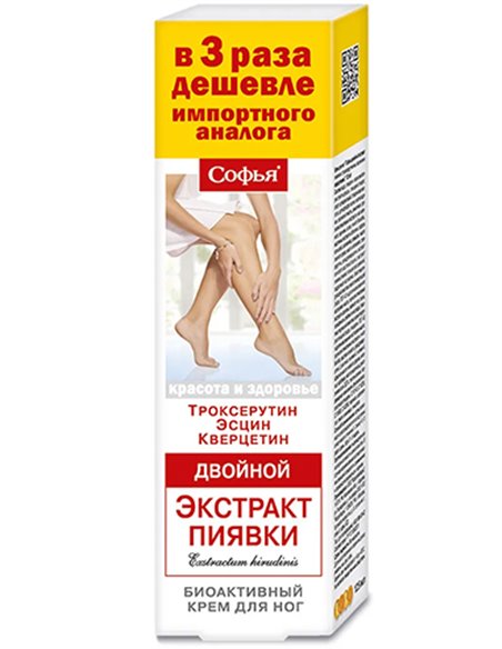 كريم القدمين "مستخلص علقة صوفيا المزدوجة مع تروكسيروتين وإسين وكيرسيتين" هو علاج طبيعي فعال حاز على ثقة الملايين من النساء الروسيات منذ فترة طويلة، ويقدم كريم صوفيا حلاً شاملاً ويقدم مساعدة فعالة في الحفاظ على جمال وصحة الساقين يحسن المظهر الجمالي للساقين ودوران الأوعية الدقيقة والتصريف اللمفاوي. يقلل من هشاشة الشعيرات الدموية وخطر التغيرات الغذائية في الجلد. تم تأكيد فعالية الكريم من خلال التجارب السريرية وسنوات عديدة من الممارسة في روسيا وخارجها.