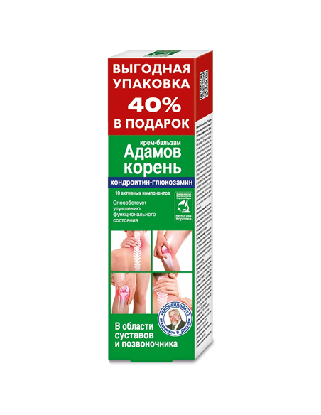 рем-бальзам для тела "Адамов корень. Хондроитин-глюкозамин" 10 активных компонентов – эффективное натуральное средство для тела в области суставов и позвоночника на основе уникального природного растения. Способствует улучшению функционального состояния, тормозит деструктивные процессы и активизирует регенерацию.Адамов корень применяется при комплексной терапии проблем опорно-двигательного аппарата, заболеваниях костной ткани, суставных соединений и мышц. Заметно снижает болевой синдром и быстро улучшает самочувствие. Препараты адамова корня с успехом применяются при проблемах с позвоночником, в том числе остеохондрозах, при ревматических и радикулитных болях, артритах и полиартритах, подагрических симптомах, ишиасе. При этом адамов корень оказывает не только обезболивающее действие, но помогает остановить воспалительные процессы, способствует регенерации поврежденных тканей. Замечено, что после использования адамова корня уменьшаются боли в суставах, возвращается подвижность, исчезает неприятный суставной "хруст”. С помощью адамова корня можно избавиться от последствий травм, ускорить исчезновение синяков и кровоподтеков, быстро справиться с последствиями растяжений, вывихов и других повреждений. Также из адамова корня готовят самые разнообразные мази, средства в виде бальзамов и прочие целебные препараты. Хондроитин сульфат – основной структурный компонент хряща и естественный защитник (хондропротектор) его клеток. Вырабатывается хрящевой тканью суставов. Повышает влагоемкость хряща, предотвращает его высыхание. Обеспечивает механические и эластические свойства суставных поверхностей, улучшает качество суставной смазки (синовиальной жидкости).Глюкозамин – один из важнейших компонентов хрящевой ткани и естественный защитник (хондропротектор) клеток хряща. Обеспечивает питание и жизнеспособность хондроцитов, препятствует разрушению хрящевых тканей, стимулирует их восстановление. Капсаицин оказывает сильное разогревающее действие, активизирует обменные процессы в мышечной ткани, улучшает микроциркуляцию. Снижает отечность, снимает мышечный спазм, является проводником для других лечебных компонентов. Блокирует действие химических медиаторов, провоцирующих воспаление и передающих болевые импульсы в ЦНС. Сабельник болотный – лекарственное растение с выраженным биостимулирующим, антибактериальным, обезболивающим, противовоспалительным, солевыводящим, противоревматическим и регенерирующим действием. Обладает многочисленными лечебными свойствами. Содержит микроэлементы (фосфор, калий, магний, медь), дубильные вещества, флавоноиды, эфирные масла, органические кислоты, каротин. Признанное народное средство для борьбы с ревматизмом, радикулитом, артритами и артрозами, отложением солей в суставах рук и ног. Способствует снятию отечности, повышает подвижность суставов и позвоночника.Лопух обладает широким спектром лечебного действия: антисептическим, антимикробным, солевыводящим, противовоспалительным, противоотечным, ранозаживляющим. Наружно применяется при подагре, ревматизме, обострении суставных заболеваний при переохлаждении, а также при травмах конечностей, ожогах и ранах. Стимулирует обмен веществ и регенерацию тканей.