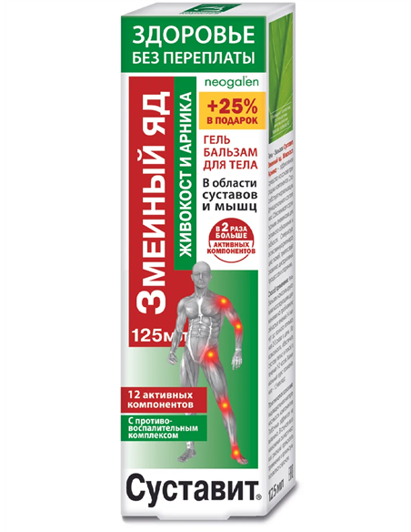 эффективное средство на основе природных компонентов. Способствует нормализации функционального состояния. Обеспечивает структурными элементами для активного обновления и гибкости. Стимулирует естественную регенерацию тканей, препятствует развитию деструктивных процессов и старению. Действие и эффективность гелябальзама обеспечены высокой биологической активностью его натуральных компонентов, обладающих выраженным положительным комплексным действием. Яд гюрзы – по своим свойствам яд гюрзы уникален и превосходит яды практически всех гадюковых змей. Мази, сделанные на основе яда гюрзы, применяются при болезнях суставов с целью снятия боли и воспаления. Высокая эффективность применения объясняется тем, что в секрете гюрзы содержатся ферменты, жирные кислоты, аминокислоты, белки, а также различные микроэлементы, оказывающее чрезвычайно сильное благотворное действие на суставы и опорнодвигательный аппарат в целом. Яд змей добавляют в мазь от радикулита, артрита, артроза, остеохондроза и прочих патологий суставной системы и позвоночника. Живокост (Окопник) благодаря рекордному количеству аллантоина, эффективно восстанавливает поврежденные ткани, отсюда и родовое название растения Symphytum officinale (греч.) – сращивать, соединять. Стимулирует регенерацию костей и хряща, улучшает качество синовиальной жидкости, заживляет суставные микротравмы. Арника горная (Arnica montana) около тысячи лет известна в Европе как непревзойденное наружное средство при травмах мягких тканей. При суставных проблемах оказывает противовоспалительное, регенерирующее, противоотечное, болеутоляющее действие.