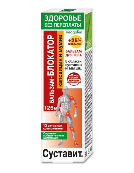 эффективное средство на основе природных компонентов. Способствует нормализации функционального состояния. Обеспечивает структурными элементами для активного обновления и гибкости. Стимулирует естественную регенерацию тканей, препятствует развитию деструктивных процессов и старению. Действие и эффективность бальзама для тела обеспечены высокой биологической активностью его натуральных компонентов, обладающих выраженным положительным комплексным действием. Капсаицин оказывает сильное разогревающее действие, активизирует обменные процессы в мышечной ткани, улучшает микроциркуляцию. Снижает отёчность, снимает мышечный спазм, является проводником для других лечебных компонентов. Блокирует действие химических медиаторов, провоцирующих воспаление и передающих болевые импульсы в ЦНС. Мумие (Asphaltum) - один из самых мощных биостимуляторов, активизирует репаративные процессы, ускоряет восстановление костных и хрящевых тканей, замедляет процессы старения сустава, способствует уменьшению ломоты, возникающей при переменах погоды. В несколько раз усиливает лечебные свойства лекарственных растений. Камфора добывается из листьев и древесины камфорного дерева Ciamomum camphora, произрастающего в Индии и Китае. При наружном применении в области суставов оказывает антисептическое, согревающее, анальгезирующее и противовоспалительное действие, расширяет кровеносные сосуды и улучшает трофику околосуставных тканей. Эфирные масла лекарственных растений оказывают антисептическое, регенерирующее, болеутоляющее, спазмолитическое, противовоспалительное, против отёчное действие.