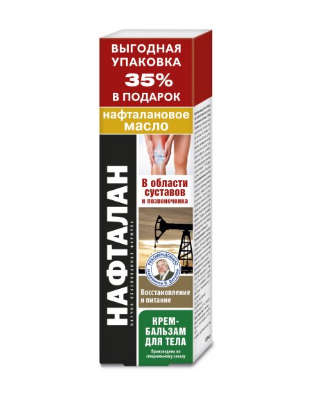 Эффективное средство в области суставов на основе нафталана и других природных компонентов. Крем-бальзам обладает уникальными целебными свойствами, он оказывает многообразное лечебное воздействие на организм человека. Обладает противовоспалительным, обезболивающим, сосудорасширяющим и стимулирующими свойствами. Нафталан используется при невралгических заболеваний: межреберная невралгия, невралгия тройничного, затылочного и седалищного нервов, а также пояснично-крестцовый и шейный плечевой радикулит, заболевания суставов, остеохондроз межпозвонковый.