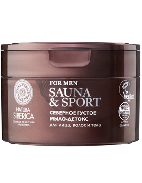Functional thick northern soap Sauna&Sport for Men will help men in any situation: it will replace shampoo, cleanser, shaving and shower gel. A unique formula with extracts of Siberian plants and black activated cedar charcoal provides unrivaled care. Cleans effectively but gently. Softens skin, hair and stubble. Refreshes and protects against dryness.