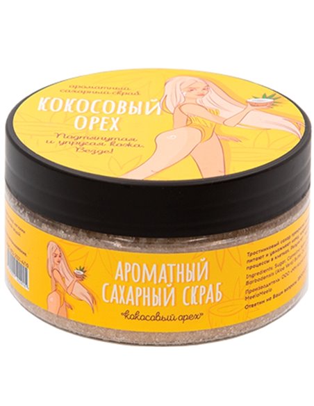 Cane sugar perfectly polishes the skin, coconut oil and aloe vera nourish and moisturize the skin, caffeine drains tissues and stimulates metabolic processes in cells. The result is tightened and elastic skin. Everywhere!