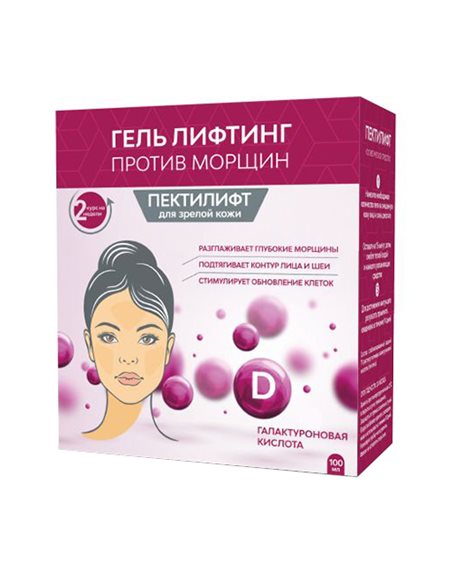 Anti-wrinkle lifting gel PECTILIFT is a natural polymer of galacturonic acid of ultra-high purity. Meets all the requirements for purity, efficiency, safety. Modern technology for processing plant components eliminates the risk of developing allergies. It has an excellent stimulating and ionizing effect on the skin. Removes traces of fatigue. Improves complexion. Pectylift gives the skin the properties it needs to look great. Due to the high content of galacturonic acid, it has a pronounced lifting effect; evens out deep wrinkles; tightens pores; prevents skin from losing elastic fibers. Penetrates into microdefects of the skin, causing increased formation of collagen and elastin; stimulates the natural renewal of facial skin cells; tones and energizes the skin. Has a mild exfoliating effect, prevents the appearance of age spots. Protects the skin; has a bactericidal (antimicrobial) effect; normalizes the pH of the skin.