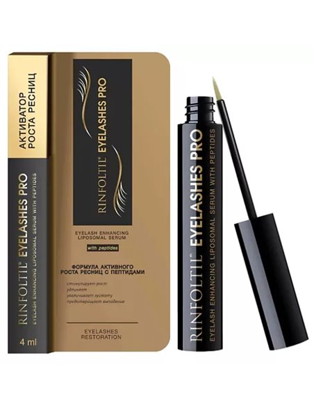 Liposomal eyelash serum with peptides RINFOLTIL® EYELASHES PRO - stimulates growth, lengthens, increases density, restores eyelashes after extension and mechanical injury. As part of the eyelash growth agent, active substances in liposomes are green tea extract, ginseng extract, keratin, inositol, D-panthenol, arginine, allantoin, sodium hyaluronate, vitamin E, biotin (vitamin B7), Myristoyl Pentapeptide-17, Biotinoyl Tripeptide- 1.