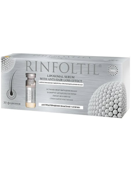 The innovative series of natural liposomal products RINFOLTIL® was created on the basis of scientific research and is aimed at preventing hair loss and re-growth. LIPOSOMAL SERUM WITH ANTI-HAIR LOSS EFFECT is recommended for various types of alopecia in mono and complex therapy due to past diseases, stress, hormonal disorders, chemical exposure and ultraviolet radiation. biologically active compounds: vitamin A stimulates the synthesis of keratin, prevents inflammation; group B vitamins: • B5 promotes the penetration of oxygen into the scalp and strengthens hair roots; • B6 activates energy, lipid, protein and water-salt metabolism; vitamin E improves blood circulation, has a powerful moisturizing and antioxidant effect; PCA zinc prevents the formation of dihydrotestosterone, which causes hair loss. Microscopic spheres - liposomes - allow to increase the bioavailability of the active compounds that make up the serum. Liposomes, due to their unique size and structure, freely deliver active substances to the hair follicle and restore the cyclic nature of the follicle's vital activity. Using LIPOSOMAL SERUM WITH ANTI-HAIR LOSS EFFECT for 90 days: