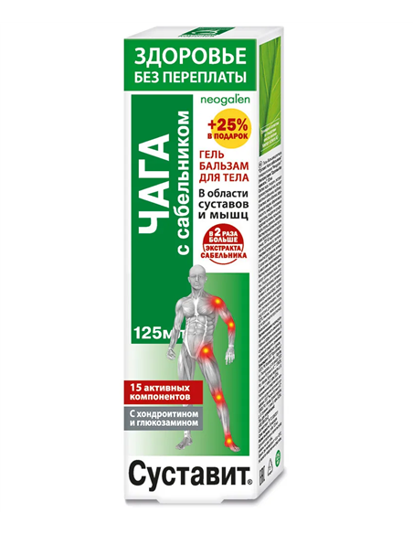 эффективное средство на основе природных компонентов. Способствует нормализации функционального состояния. Обеспечивает структурными элементами для активного обновления и гибкости. Стимулирует естественную регенерацию тканей, препятствует развитию деструктивных процессов и старению.Действие и эффективность геля бальзама обеспечены высокой биологической активностью его натуральных компонентов, обладающих выраженным положительным комплексным действием. Чага мощный биогенный стимулятор и антиоксидант широкого спектра действия. Замедляет дегенеративные процессы в суставной ткани. Содержит редкий природный антисептик бетулин, обладающий выраженными противовоспалительными свойствами. Оказывает восстанавливающее, спазмолитическое, противоотечное и обезболивающее действие. Улучшает кровоснабжение и метаболизм в области суставов, стимулирует выведение токсинов и солевых отложений. Сабельник болотный лекарственное растение с выраженным биостимулирующим, антибактериальным, обезболивающим, противовоспалительным, солевыводящим, противоревматическим и регенерирующим действием. Обладает многочисленными лечебными свойствами. Содержит микроэлементы (фосфор, калий, магний, медь), дубильные вещества, флавоноиды, эфирные масла, органические кислоты, каротин. Признанное народное средство для борьбы с ревматизмом, радикулитом, артритами и артрозами, отложением солей в суставах рук и ног. Способствует снятию отечности, повышает подвижность суставов и позвоночника.Лопух обладает широким спектром лечебного действия: антисептическим, антимикробным, солевыводящим ,противовоспалительным, против отёчным, ранозаживляющим. Наружно применяется при подагре, ревматизме, обострении суставных заболеваний при переохлаждении, а также при травмах конечностей, ожогах и ранах. Стимулирует обмен веществ и регенерацию тканей. Девясил в традиционной медицине считается растением, лечащим от девяти недугов. При заболеваниях суставов оказывает антисептическое противовоспалительное, болеутоляющее, тонизирующее, заживляющее действие, улучшает обмен веществ в тканях. Зверобой воздействует как местно анестезирующее, противовоспалительное, антисептическое средство. Снимает мышечные спазмы, улучшает питание суставов, трофику тканей, ускоряет регенерацию хряща. Помогает при травмах, ушибах, ожогах, ранах, болях ревматического характера. Оказывает также ранозаживляющее и бактерицидное действие. Содержит множество микроэлементов, флавоновые гликозиды, рутин, кверцитрин, каротин. Камфора средство растительного происхождения, добывается из листьев и древесины камфорного дерева Ciamomum camphors, произрастающего в Индии и Китае. При наружном применении в области суставов оказывает антисептическое, согревающее, анальгезирующее и противовоспалительное действие, расширяет кровеносные сосуды и улучшает трофику около суставных тканей. Глюкозамин и коллаген строительные материалы для естественного восстановления тканей опорно двигательного аппарата. Обеспечивают питание и жизнеспособность хондроцитов, способствуют регенерации и укреплению хрящей, связок, повышают их прочность и упругость, улучшают подвижность суставов и позвоночника. Эфирные масла лекарственных растений оказывают антисептическое, регенерирующее, болеутоляюще