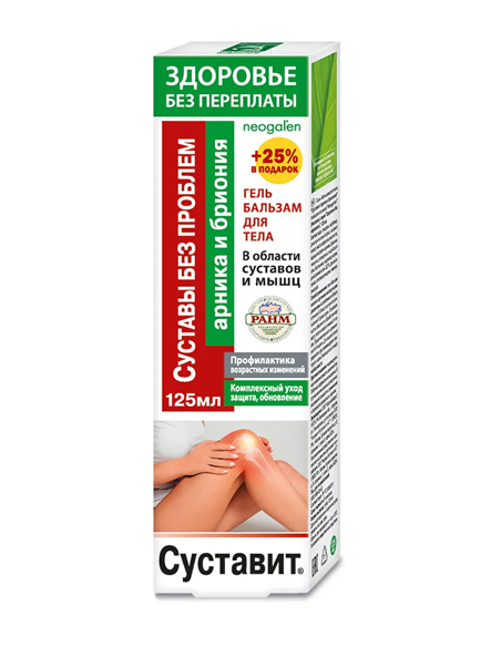 эффективное средство на основе природных компонентов. Способствует нормализации функционального состояния. Обеспечивает структурными элементами для активного обновления и гибкости суставов. Стимулирует естественную регенерацию тканей, препятствует развитию деструктивных процессов и старению. Действие и эффективность геля бальзама для тела обеспечены высокой биологической активностью его натуральных компонентов, обладающих выраженным положительным комплексным действием. Арника горная (Arnica montana) произрастает на полянах хвойных лесов, занесена в красную книгу. Широко используется в народной медицине. Больше тысячи лет известна в Европе как непревзойденное наружное средство при травмах мягких тканей. При суставных недугах оказывает противовоспалительное, регенерирующее, против отёчное, болеутоляющее действие. Массаж с арникой очень эффективен при спортивных травах и проблемах с суставами. Бриония белая (Bryonia alba, переступень белый) ядовитое лекарственное растение с многочисленными лечебными свойствами. При заболеваниях суставов оказывает противовоспалительное, болеутоляющее, против ревматическое, против отёчное действие. В народной медицине широко применяется при лечении ревматизма, полиартрита, радикулита, подагры, невралгии, неврита, ишиалгии, миозита, люмбаго, плексита. Используется в гомеопатии. Масло розмарина (Rosmarinus officinalis) при наружном применении стимулирует микро циркуляцию, активизирует обменные процессы, предупреждает образование трофических язв при венозной недостаточности, способствует их заживлению. Повышает эластичность соединительной ткани, укрепляет опорно мышечный аппарат, оптимизируя гемодинамику и улучшая венозный отток. Оказывает болеутоляющее, противовоспалительное и антисептическое действие. Индийский лук (Ornithogalum caudatum) обладает самым сильным среди растительных средств разогревающим эффектом, а также выраженным обезболивающим и противовоспалительным действием. Содержащиеся в нем алкалоиды и колхицин снижают выработку мочевой кислоты и используются для профилактики и лечения приступов подагры. Эвкалипт масло спаситель, придает силы, помогает быстро восстановиться после стресса и болезни. Увеличивает количество энергии, ответственной за здоровье и долголетие. Эфирные масла лекарственных растений оказывают антисептическое, регенерирующее, болеутоляющее, спазмолитическое, противовоспалительное, против отёчное действие. Широко применяются в медицине при лечении ревматизма, артрита, остеохондроза, подагры, нарушений микро циркуляции.