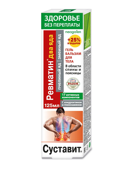 Эффективное средство на основе природных компонентов в области суставов. Стимулирует естественную регенерацию тканей, препятствует развитию деструктивных процессов и старению. Способствует нормализации функционального состояния суставов и мышц. Эффективность геля-бальзама для тела обеспечены высокой биологической активностью его натуральных компонентов. Пчелиный яд обладает выраженным противовоспалительным, разогревающим, обезболивающим, бактерицидным, активизирует кровоток, улучшает обмен веществ в суставе и питание суставных тканей. Повышая проницаемость кожных покровов, способствует глубокому проникновению лечебных компонентов в проблемную область. Змеиный яд на основе яда гюрзы, применяется при болезнях суставов с целью снятия боли и воспаления. Оказывает чрезвычайно сильное благотворное действие на суставы и опорно - двигательный аппарат в целом