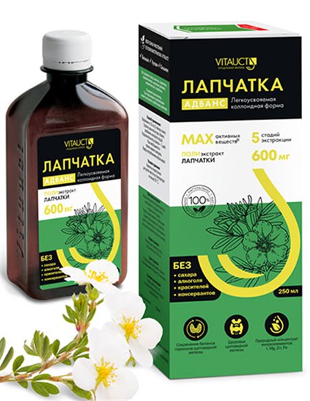 The results of clinical studies indicate that due to the rich composition of biologically active substances, including the high content of elemental iodine and iodide anion, white cinquefoil (rhizome with roots) can influence the level of thyroid hormones - thyroxine (T4) and triiodothyronine (T3) and is an effective remedy for the treatment of thyroid diseases - normalizes the functional state of the thyroid gland, mitigates the course of hypothyroidism, hyperthyroidism, autoimmune thyroiditis, endemic and euthyroid goiter, thyroid hyperplasia. White cinquefoil is a natural concentrate of microelements: iodine, selenium, zinc, magnesium, copper, iron, silicon, etc.