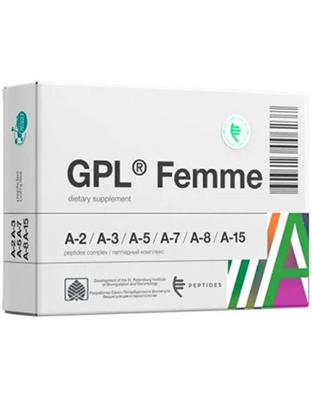 GPL® Femme is an innovative women's health complex based on natural peptide extracts. Developed in collaboration with the St. Petersburg Institute of Bioregulation and Gerontology and the Peptides company, this product is aimed at minimizing post-Covid changes and improving the functioning of the vascular, nervous, endocrine and reproductive systems in women. GPL® Femme helps to harmonize the body, prolong youth and maintain health through the physiological restoration of the neuroendocrine axis. The complex restores metabolic processes and fights insulin resistance, strengthens the immune system and regulates the functioning of the pineal gland and adrenal glands. It also helps reduce stress levels and prevent early exhaustion of the reproductive system, slowing down the aging process. The composition of GPL® Femme is designed taking into account the characteristics of the female body, which allows you to achieve optimal balance and overall well-being.