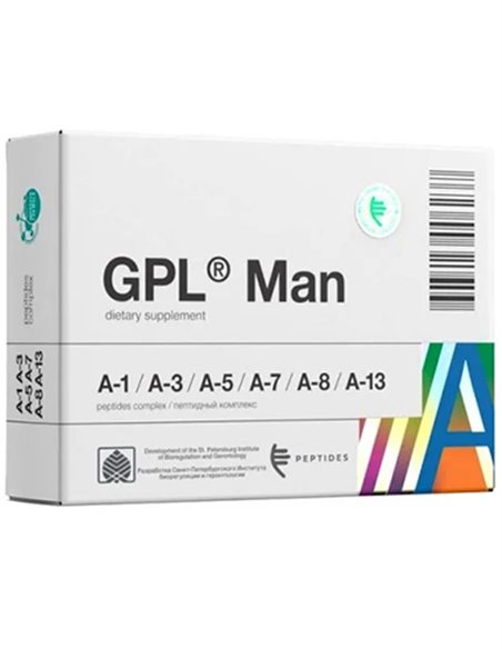 GPL® Man is an advanced men's health complex formulated with natural peptide extracts. Created jointly by Peptides and the St. Petersburg Institute of Bioregulation and Gerontology, this product helps cope with post-Covid changes and improve the functions of the vascular, nervous, endocrine and reproductive systems. GPL® Man helps to harmonize the body, prolong youth and maintain health through the physiological restoration of the neuroendocrine axis. Using minimal doses of targeted drugs, it restores metabolic processes and fights insulin resistance, strengthens the immune system and sets the correct rhythm of the pineal gland and adrenal glands. The product also helps reduce stress levels and prevent early exhaustion of the reproductive system, slowing down the aging process. GPL® Man is formulated to meet the needs of the male body to achieve optimal balance and overall well-being.