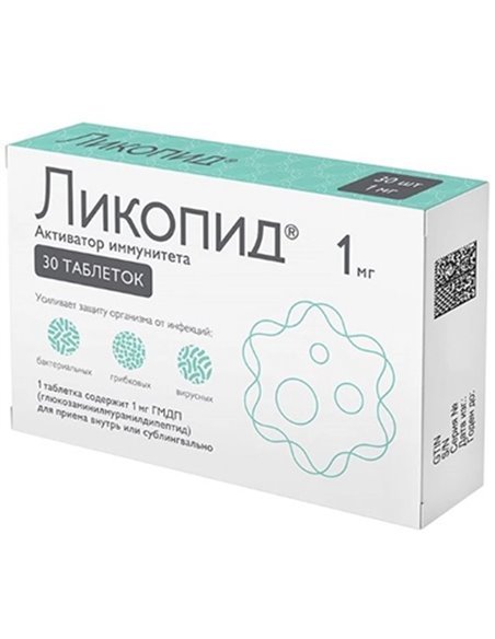 Likopid is a drug that contains glucosaminylmuramyl dipeptide - a synthetic analogue of the structural fragment of the membrane (peptidoglycan) of bacterial cells. It is an activator of innate and acquired immunity, strengthens the body’s defense against viral, bacterial and fungal infections; has an adjuvant effect in the development of immunological reactions. Likopid is intended for the treatment and prevention of various diseases, such as recurrent infections of the upper and lower respiratory tract in the acute and remission stages, acute and chronic purulent-inflammatory diseases of the skin and soft tissues (pyoderma, furunculosis and others), herpes infection. Take Likopid in the form of tablets orally or sublingually on an empty stomach, 30 minutes before meals, as recommended by your doctor.
