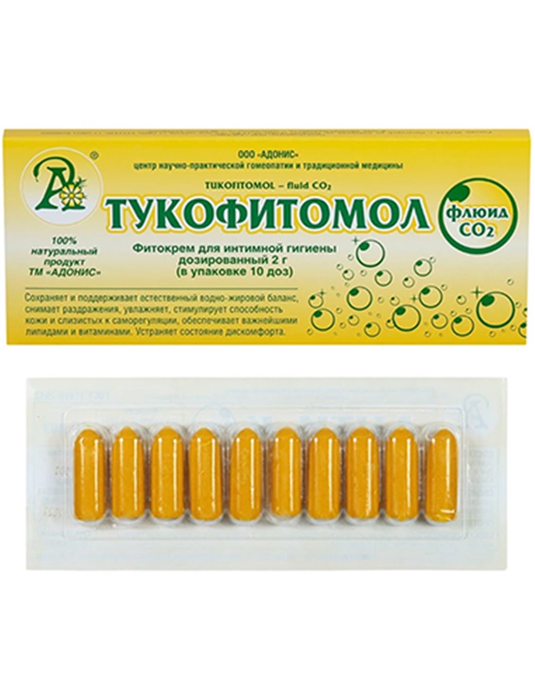 Scope - gynecology. The phytocream is intended for intimate hygiene. Release form - suppositories. After carrying out hygiene procedures, 1 dose of the drug "Tukofitomol - fluid CO2" is introduced into the rectum or vulva or applied to the skin areas around. The package contains 10 doses-suppositories, designed for 1 course of administration.