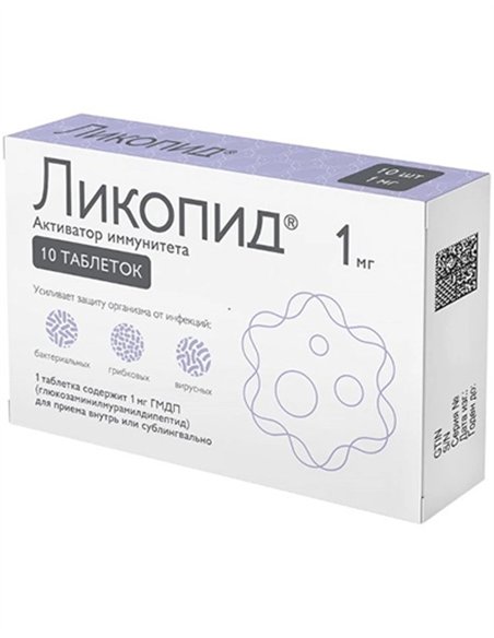 Likopid is a drug that contains glucosaminylmuramyl dipeptide - a synthetic analogue of the structural fragment of the membrane (peptidoglycan) of bacterial cells. It is an activator of innate and acquired immunity, strengthens the body’s defense against viral, bacterial and fungal infections; has an adjuvant effect in the development of immunological reactions. Likopid is intended for the treatment and prevention of various diseases, such as recurrent infections of the upper and lower respiratory tract in the acute and remission stages, acute and chronic purulent-inflammatory diseases of the skin and soft tissues (pyoderma, furunculosis and others), herpes infection. Take Likopid in the form of tablets orally or sublingually on an empty stomach, 30 minutes before meals, as recommended by your doctor.