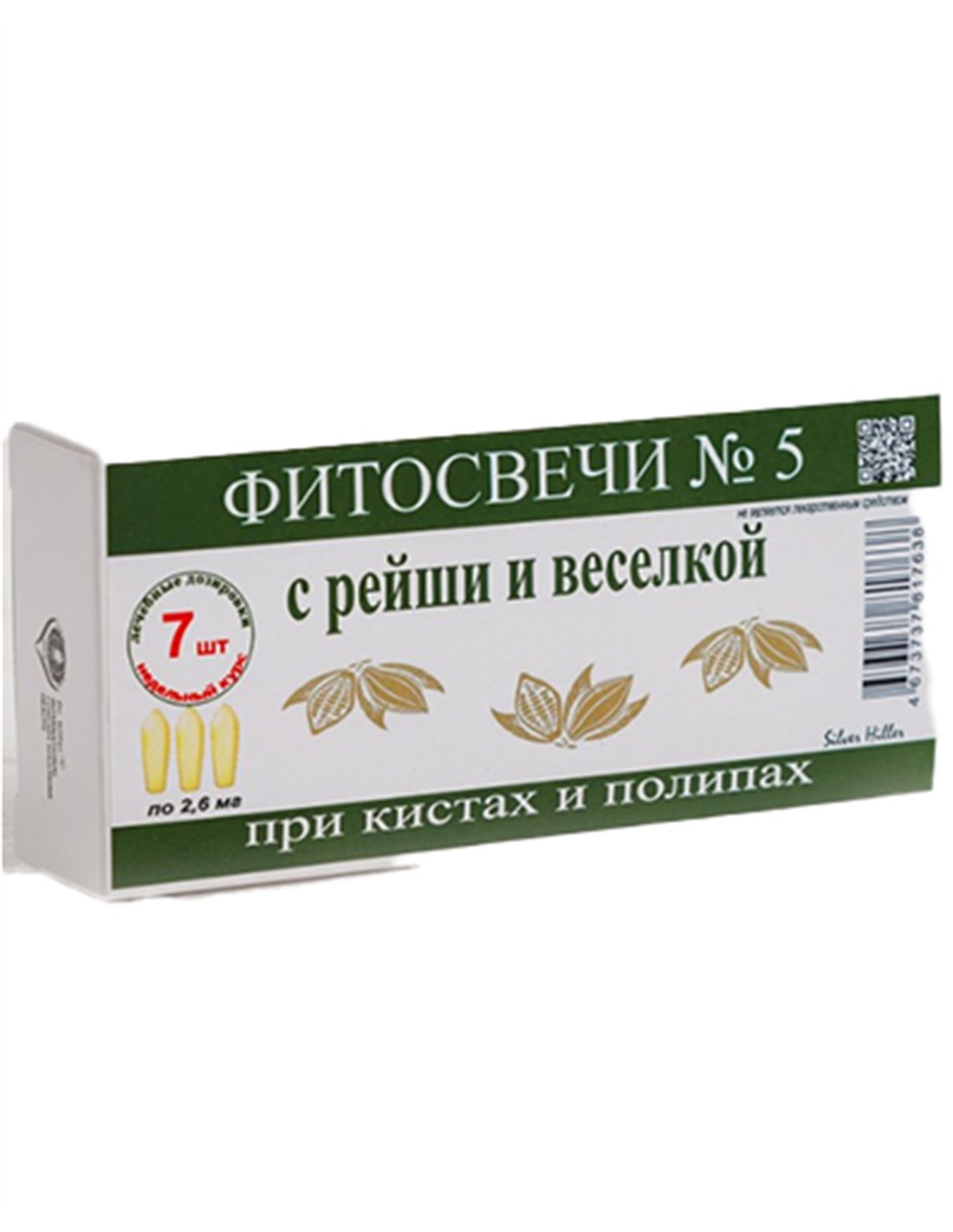 Phytosuppositories #5 "With Reishi and Veselka" contain: reishi mushroom (body) extract, veselka mushroom (body) extract, and natural Indonesian cocoa butter. 54.0% fat, 11.5% protein, 9.0% cellulose, 7.5% starch and polysaccharides, 6.0% tannins and coloring agents, 5.0% water, 2.6% minerals and salts, 2.0% organic acids and flavoring agents, 1.0% saccharides, and 0.2% caffeine, flavonoids, tannins, arbutins, quinones, iridoids, copper, titanium, iron, manganese, and zinc.