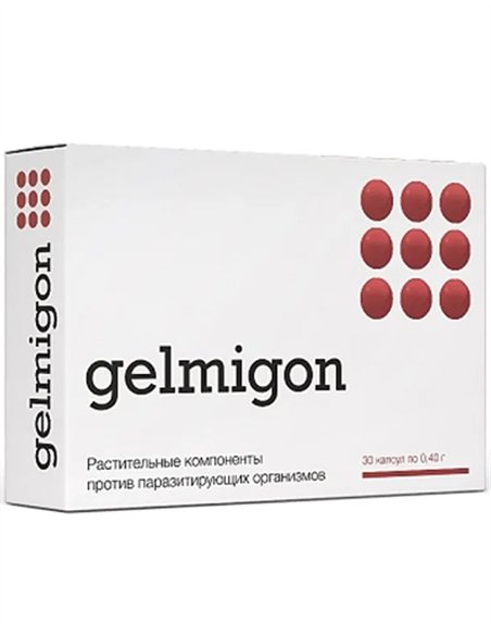 The complex medicine on the basis of vegetable raw materials possessing a wide range of anti-parasitic action. It forms the necessary concentration of vegetable poisons in an organism, intolerable for parasites, but safe for human. The active components of 'Gelmigon' are successful in fighting against main types of the parasitizing organisms of various localization, strengthen the resilience of an organism and don't cause damage to health. 'Gelmigon', unlike many modern medicines — toxic and not dealing with the main objective — is absolutely harmless and effective.