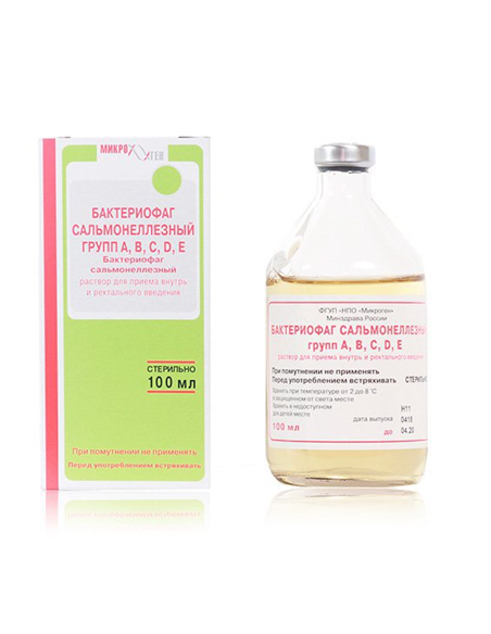 COMPOSITION: Sterile purified filtrate of phagolysates of the most common Salmonella (Appelman activity) gr. A - Salmonella paratyphi A; gr. B - S. paratyphi B. S. heiclherg; gr. C - S. newport, S. choleraesuis, S. oranienburg, S. infantis, rp. D - S. dublin, S. enlerilidis; gr. E - S. anatum, S. newlands - not less than 10-4; Salmonella gr. B - S. typhimurium - not less than 10-5 - up to 1 ml.