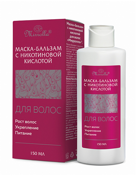 Mask-balm with nicotinic acid promotes hair growth and strengthening, softens and provides easy combing. Nicotinic acid (vitamin B3) strengthens hair follicles, improves microcirculation, activates hair growth.