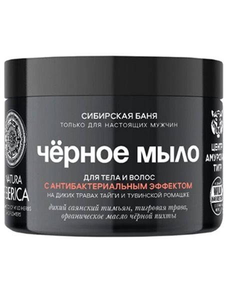 Black soap for body and hair “Siberian Bath” with a rich composition of antibacterial and antimicrobial natural ingredients cleanses the body and hair 100%. Helps increase the overall immunity of the body. The aroma of wild Siberian herbs completely immerses you in the atmosphere of a real Siberian bathhouse. With it, taking a shower or your favorite bath turns into a perfect bath ritual. Chamomile extract has the strongest natural antibacterial properties due to its high content of tannins and azulene. Organic black fir oil, a powerful natural antiseptic, effectively cleanses skin and hair, improves cell immunity, and protects against environmental influences. Tiger grass extract, known for its powerful antioxidant properties, deeply nourishes the skin and protects the body. Contains tannins (up to 25%), flavonoids and phytosterols. Wild Sayan thyme contains tannins and thymol, as well as vitamins B and C. It perfectly cleanses the skin and improves the overall tone of the body.