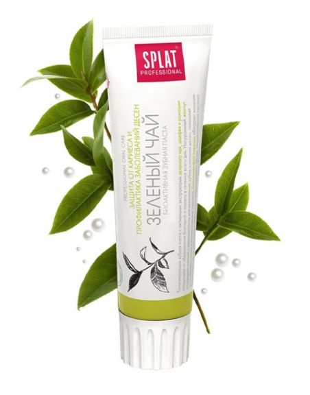 Splat Green Tea toothpaste contains active extracts of green tea, sage and camomile, provides all day protection against plaque development and has a soothing effect on gums.