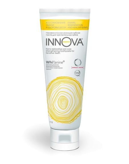 INNOVA toothpaste with effective Hydroxyapatite dosage (2.25%) in active nanoform penetrates deeply into open dentinal tubules and completely seals them, strengthens enamel and decreases sensitivity of teeth, including cervical area.