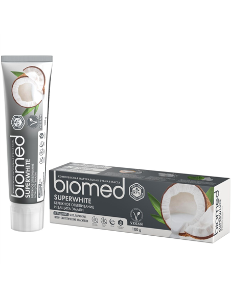 Whitening toothpaste BIOMED® Superwhite with natural coconut oil and papain for gentle whitening of sensitive tooth enamel.