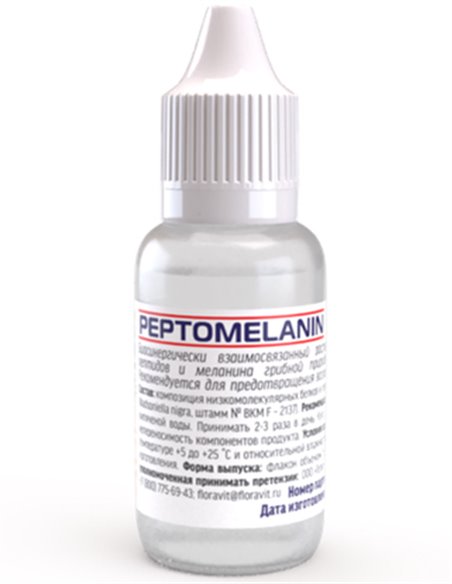 PeptoMelanin is a biosynergistically interconnected solution of a composition of low-molecular proteins, peptides and melanin of fungal origin, ensuring the health of the thyroid gland and the prevention of neoplasms, age-related, sclerotic, dystrophic changes in tissues and blood vessels. Homeostasis bioregulator.