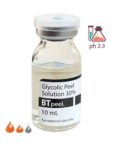 Гликолевая кислота является энхансером, разрушает межклеточные связи, обладает мощным стимулирующим воздействием на клетки дермы, нормализует клеточный метаболизм, стимулирует репаративный потенциал клеток. Пилинг с гликолевой кислотой разрыхляет роговой слой, отшелушивает клетки, стимулирует фибробласты, оказывает противовоспалительное и антисептическое действие. Показания к применению гликолевого пилинга: возрастные изменения, акне, постакне, гиперкератоз, гиперпигментация. ВАЖНО! Гликолевый пилинг BTpeel имеет очень низкий pH (=2,3), необходимо использовать НЕЙТРАЛИЗАТОР для завершения процедуры, избегать попадания в глаза!