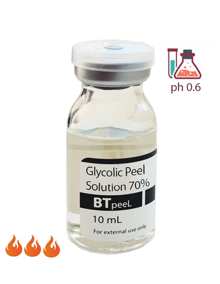 Гликолевая кислота является энхансером, разрушает межклеточные связи, обладает мощным стимулирующим воздействием на клетки дермы, нормализует клеточный метаболизм, стимулирует репаративный потенциал клеток. Пилинг с гликолевой кислотой разрыхляет роговой слой, отшелушивает клетки, стимулирует фибробласты, оказывает противовоспалительное и антисептическое действие. Показания к применению гликолевого пилинга: возрастные изменения, акне, постакне, гиперкератоз, гиперпигментация. ВАЖНО! Гликолевый пилинг BTpeel имеет очень низкий pH (=0,6), необходимо использовать НЕЙТРАЛИЗАТОР для завершения процедуры, избегать попадания в глаза!