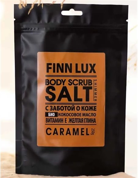 Ingredients: sea salt, yellow clay, coconut oil, vitamin E, mineral shimmering powder, cosmetic fragrance "Salted caramel".