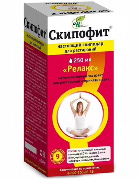 Auxiliary agent for turpentine baths (according to Zalmanov): a multi-active extract is added to a bath of White emulsion or Yellow solution "Skipofit" 5-10 ml (1-2 tsp), after dissolving and shaking it in a small amount of hot water (t = 40°C). The volume of the bath is 200 liters, the duration of the procedure is 15 minutes, the water temperature is 36°C.
