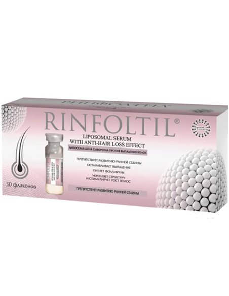 The innovative series of natural liposomal products RINFOLTIL® was created on the basis of scientific research and is aimed at preventing hair loss and re-growth. LIPOSOMAL SERUM WITH ANTI-HAIR LOSS EFFECT is recommended for various types of alopecia in mono and complex therapy due to past diseases, stress, hormonal disorders, chemical exposure and ultraviolet radiation. biologically active compounds: vitamin A stimulates the synthesis of keratin, prevents inflammation; vitamins of group B: • B3 strengthens the natural pigment of the hair, • B5 promotes the penetration of oxygen into the scalp and strengthens the hair roots, • B6 activates energy, lipid, protein and water-salt exchanges, • B9 accelerates hair growth, restores strength and shine, • B12 prevents the development of early gray hair, relieves dullness and brittle hair; vitamin E improves blood circulation, has a powerful moisturizing and antioxidant effect. Increase the bioavailability of active compounds, input which are part of the serum, allow microscopic spheres - liposomes. Liposomes, due to their unique size and structure, freely deliver active substances to the hair follicle and restore the cyclic nature of the follicle's vital activity. Using LIPOSOMAL SERUM WITH ANTI-HAIR LOSS EFFECT for 90 days:
