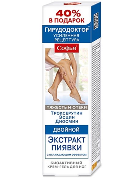 Foot cream-gel with a cooling effect "Sofya double leech extract with troxerutin, escin and diosmin" is a natural effective remedy that has long earned the trust of millions of Russian women. Sophia cream provides a comprehensive solution and provides effective assistance in maintaining the beauty and health of feet, improves aesthetic appearance of the legs, microcirculation and lymphatic drainage; reduces capillary fragility and the risk of trophic skin changes. Thanks to its pronounced cooling effect, it returns a comfortable feeling of lightness and coolness to the legs, relieves fatigue and heaviness in the legs, and promotes muscle relaxation. Medical leech is rightfully considered one of the best remedies for the treatment of varicose veins. Its salivary glands contain about 100 biologically active substances that have an intense therapeutic effect on blood vessels, improve blood composition, and have an analgesic and healing effect. When applied externally, medicinal leech extract accelerates the healing of trophic ulcers and improves skin condition. Medical leech extract (leeches) is a unique natural remedy for the treatment of varicose veins of the legs. Its salivary glands contain about 100 biologically active substances that have an intense therapeutic effect on blood vessels, improve blood composition, and have an analgesic and healing effect. Medicinal leech enzymes reduce blood clotting (they are anticoagulants of direct rapid action), strengthen and restore the inner surface of affected veins, reduce painful manifestations, eliminate vascular and muscle spasms, promote the formation of new capillaries, resulting in improved blood microcirculation and unloading of the venous system. Medicinal extracts plants and natural oils provide a capillary-strengthening and venotonic effect, neutralize the effect of free radicals that destroy the vascular wall, and increase the level of antioxidant protection. Menthol provides a cooling effect that promotes greater comfort, relieving fatigue and evening heaviness in the legs. The liposomal-emulsion complex ensures rapid and deep penetration of the active substances, without reducing their effectiveness, through the skin deep into the tissues. Troxerutin is a highly effective drug used to provide anti-edematous, anti-inflammatory, analgesic, and venotonic effects. Copes with leg ulcers, trophic skin lesions, static heaviness in the lower extremities. Escin has an anti-inflammatory effect, which is mainly realized in the initial phase of inflammation. Escin, by compacting the walls of capillaries, reduces their fragility and permeability, which increase during the inflammatory reaction. Such effects of escin reduce stagnation in the veins and the accumulation of fluid in tissues, preventing the development of edema. Diosmin - tones the veins, reduces their distensibility, and also prevents the appearance of stagnation. Increases lymph circulation, due to which swelling goes away and excess fluid is eliminated faster. Diosmin strengthens capillary walls, so that the vessels are not damaged by the slightest injury.