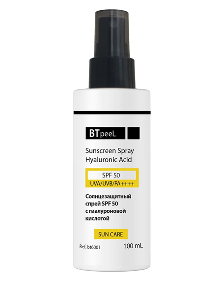 Максимальная защита кожи SPF-50 от солнечных лучей и предотвращение преждевременного старения кожи. Солнцезащитный cпрей SPF-50 BTpeel является универсальным для лица и тела. Можно использовать как самостоятельный продукт в период высокой солнечной активности, а также в качестве постпроцедурного ухода после проведенных косметологических процедур (пилингов, контурной пластики, фотоомоложения и других). Содержит высокую концентрацию cолнечных фильтров, витамин Е и гиалуроновую кислоту. Кожа моментально увлажнена и максимально защищена от всех видов ультрафиолета (UVA/UVB/PA++++ ).