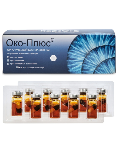 KapsOila Oko-Plus® is an organic lipophilic booster with native formulation of biologically active anthocyanins from blueberries, Blakeslea trispora producing strains, luteolin, alfalfa fruits in an activator: beta-carotenoids and omega-3, omega-6 fatty acids, enhanced with amino acid and antioxidant complex.