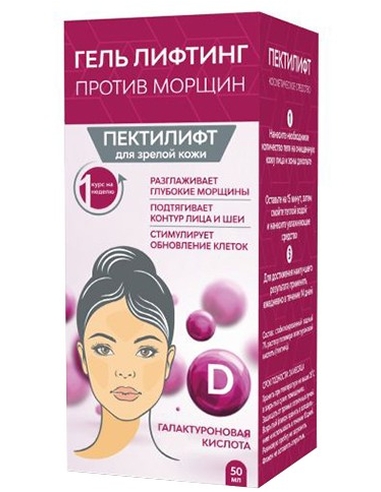 Гель лифтинг против морщин ПЕКТИЛИФТ - натуральный полимер галактуроновой кислоты сверхвысокой степени очистки. Отвечает всем требованиям чистоты, эффективности , безопасности. Современная технология обработки растительных компонентов исключает риск развития развития аллергии. Оказывает превосходный стимулирующие и ионизирующих эффект на кожу. Снимает следы усталости. Улучшает цвет лица. Пектилифт придает коже, свойства, которые необходимы ей,чтобы выглядеть великолепно. Благодаря высокому содержанию галактуроновой кислоты оказывает ярко выраженное лифтинговое действие; выравнивает глубокие морщины; сужает поры ;препятствует потере кожей эластичных волокон. Проникает в микродефекты кожи, вызывая усиленное образование коллагена и эластина;стимулирует естественное обновление клеток кожи лица; тонизирует и наполняет кожу энергией. Обладает мягким отшелушивающим действием, препятствует появлению пигментных пятен. Защищает кожу; обладает бактерицидным (антимикробным) действием; нормализует pН кожи.
