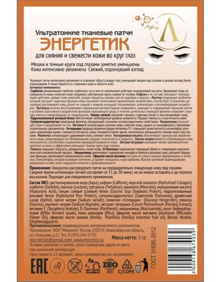 Состав INCI: дистиллированная вода (Aqua), морской коллаген (Hydrolized Collagen), Glycine Soja (Soybean), Protein (and) Hydrolyzed Rice Protein (and) Superoxide Dismutase, сорбитол (Sorbitol), лактоза (Lactose), кофеин (Caffeine), трегалоза (Trehalose), маннитол (Mannitol), гиалуроновая кислота (Hyaluronic Acid), лактат натрия (Sodium lactate), альфа глюкозил гесперидин (Glucosyl Hesperidin), глюкоза (Glycosa), аллантоин (Allantoin), альгинат натрия (Sodium Alginate), экстракт петрушки (Carum Petroselinum (Parsley) Extract), лизат бифидобактерий (Bifida ferment lysate), фукус пупырчатый (Fucus vesiculosus extract), лист подорожника экстракт (Plantago Major (Plantain) leaf extract), витамин Е (Tocopheryl Acetate), D-Пантенол (Panthenol), ниацинамид (Niacinamide), мика шелковая (Mica), эфирное масло жасмина (Jasminum Officinalis Flower Oil), Benzyl Alcohol, Ethylhexylglycerin.