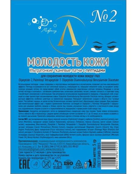 Состав INCI: дистиллированная вода (Aqua), морской коллаген (Hydrolized Collagen), сорбитол (Sorbitol), лактоза (Lactose), маннитол (Mannitol), гиалуронат натрия (Sodium Hyaluronate), кофеин (Caffeine), альфа глюкозил гесперидин (Glucosyl Hesperedin), трегалоза (Trehalose), глюкоза (Glycosa), лактат натрия (Sodium lactate), ниацинамид (Niacinamide), Acetyl Tetrapeptide-5, Acetyl Hexapeptide-8, экстракт петрушки (Carum Petroselinum (Parsley) Extract), лизат бифидобактерий (Bifida ferment lysate), фукус пупырчатый (Fucus vesiculosus extract), лист подорожника экстракт (Plantago Major (Plantain) leaf extract), витамин Е (Tocopheryl Acetate), D-Пантенол (Panthenol), альгинат натрия (Sodium Alginate), эфирное масло жасмина (Jasminum Officinalis Flower Oil), Benzyl Alcohol, Ethylhexylglycerin, мика шелковая (Mica).