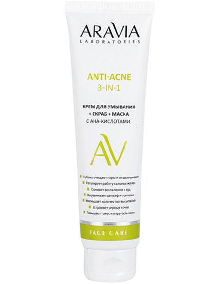 Мультиактивное очищающее средство с AHA-кислотами объединяет в себе действие крема для умывания, скраба и маски для лица. Комплекс активных компонентов глубоко очищает поры, регулирует работу сальных желез, уменьшает количество высыпаний, снимает воспаления и покраснения, устраняет черные точки. Средство выравнивает рельеф и тон кожи, сглаживает следы постакне, увлажняет и повышает упругость кожи. Назначение: глубокое очищение, отшелушивание, устранение черных точек, борьба с воспалениями. Рекомендации по использованию: 1-2 раза в неделю. Объем: 100 мл.