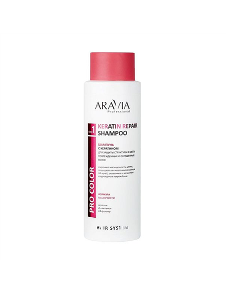Насыщенная кератиновая формула шампуня для деликатного очищения, активного восстановления поврежденных волос и защиты цвета после окрашивания. Являясь натуральным строительным компонентом волоса, молекула кератина успешно встраивается в его глубинные слои, тем самым значительно повышая плотность и устойчивость к повреждениям и внешним раздражителям. Шампунь укрепляет волокно волоса, помогает продлить эффект от процедуры окрашивания, надолго сохраняя максимальную интенсивность цвета и предотвращая его вымывание.Д-пантенол сглаживает кутикулу и наполняет влагой безжизненные пряди, облегчает процесс укладки и делает волосы послушными. Благодаря своей способности задерживаться на поверхности прядей тончайшей мономолекулярной мантией УФ-фильтр в составе шампуня препятствует разрушению УФ-лучами липидного слоя, важного для здоровья волосяного стержня, обеспечивая таким образом защиту ослабленным поврежденным волосам, возвращая им мягкость, шелковистость и блеск. Предотвращает потускнение цвета окрашенных волос, а также защищает от «выгорания» натуральные пряди.Шампунь подходит для всех типов волос, но наиболее необходим волосам со слабой нарушенной структурой: пористым, истонченным, сухим, ломким, тусклым, а также химически обработанным волосам. Результат регулярного применения – качество и внешний вид волос заметно улучшены, дефицит белка устранен, структура волос гладкая и эластичная, а яркость цвета под надежной защитой.Назначение: шампунь для мягкого очищения и уплотнения структуры поврежденных и окрашенных волос, защиты цвета волос от потускнения.Рекомендации для использования: для профессионального и домашнего использования.Объем: 400 мл.