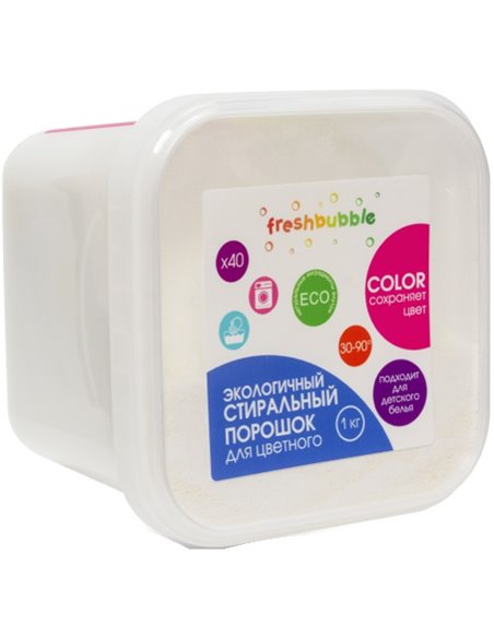 Натуральный порошок для стирки цветного белья Freshbubble подходит для всех типов цветных тканей. Удаляет все виды пятен и сохраняет насыщенность цветов даже после многочисленных стирок.
